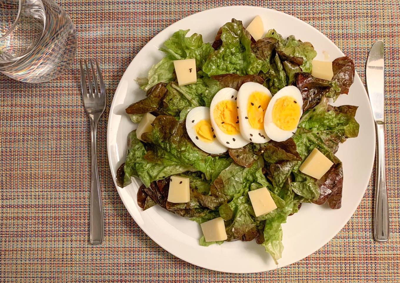 - Placez 2 cuillères à soupe de sauce vinaigrette sur les feuilles et bien mélanger. Coupez l'œuf à la coque en quatre et placez-le au centre de la salade. Coupez le comté en cubes et placez-le tout autour. Enfin, ajoutez un peu de graines de sésame noires sur le dessus. Bon appétit!