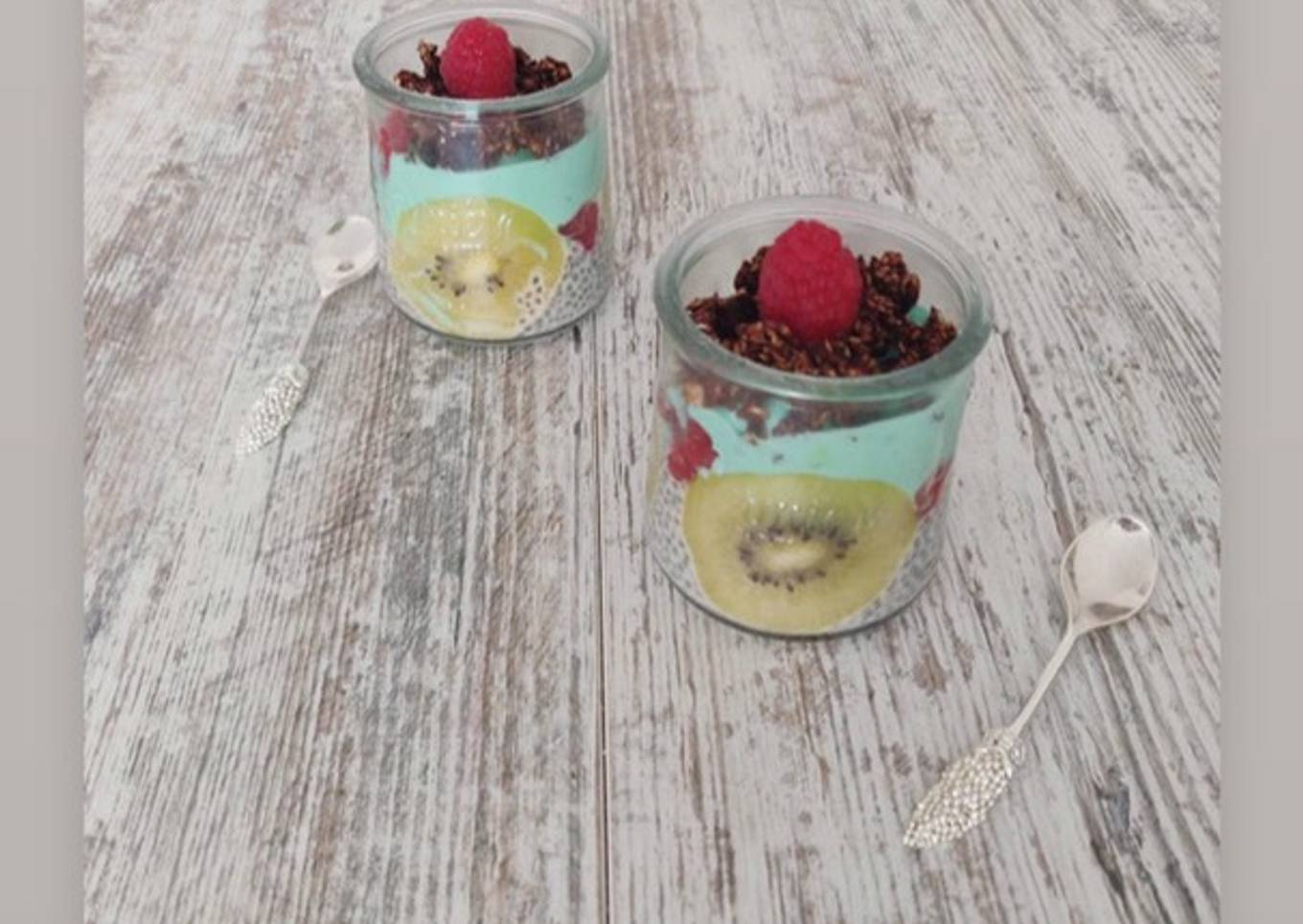 - Le lendemain, dresser les verrines en alternant une couche de chia, des fruits, du fromage blanc + le reste de sucre (pour la couleur, j’ai mélangé un peu de thé matcha)