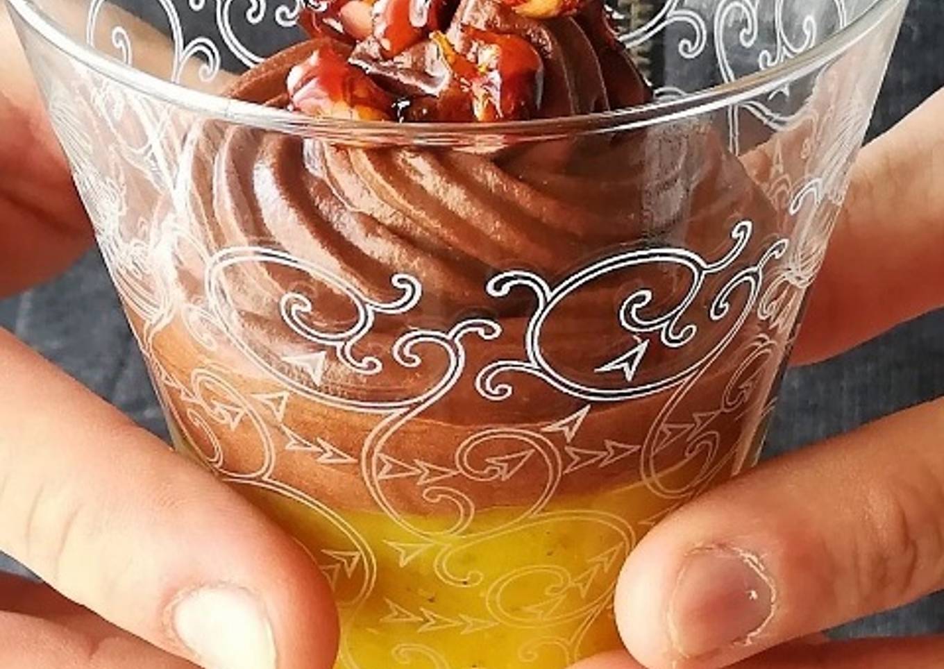- Mettez la chantilly coco-chocolat dans une poche à douille. Couvrez la compote de mangue, des 6 verrines, avec.
