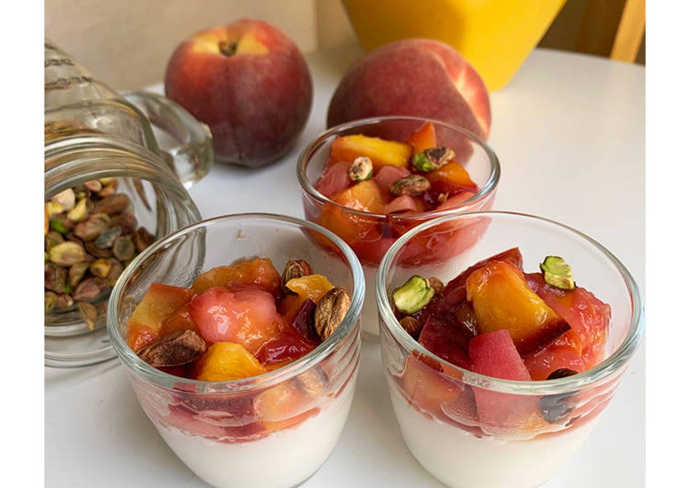 - Pendant ce temps, dénoyautez et coupez en petits morceaux les pêches, puis faites-les revenir dans une poêle avec 3 cuillères à soupe d’eau et 1 cuillère à soupe de sirop d’agave à feu moyen.