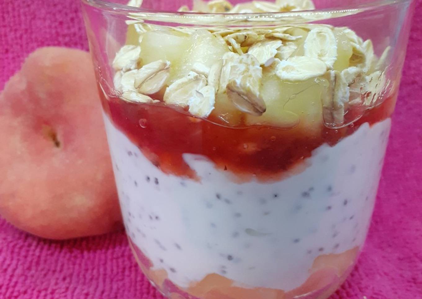 - Mélanger le skyr et les graines de chia, laisser poser 15 mn, et incorporer le mélange dans la verrine sur les morceaux de pêche.